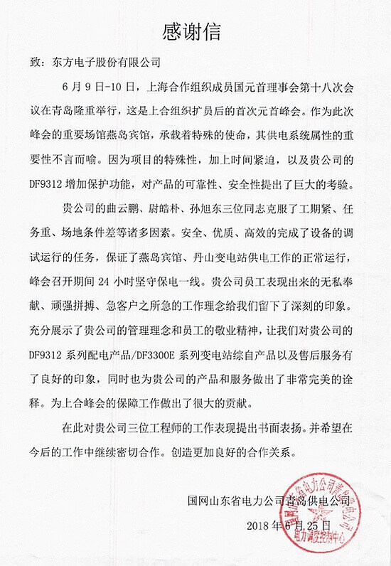 公司圆满完成上合青岛会议保电受用户表扬